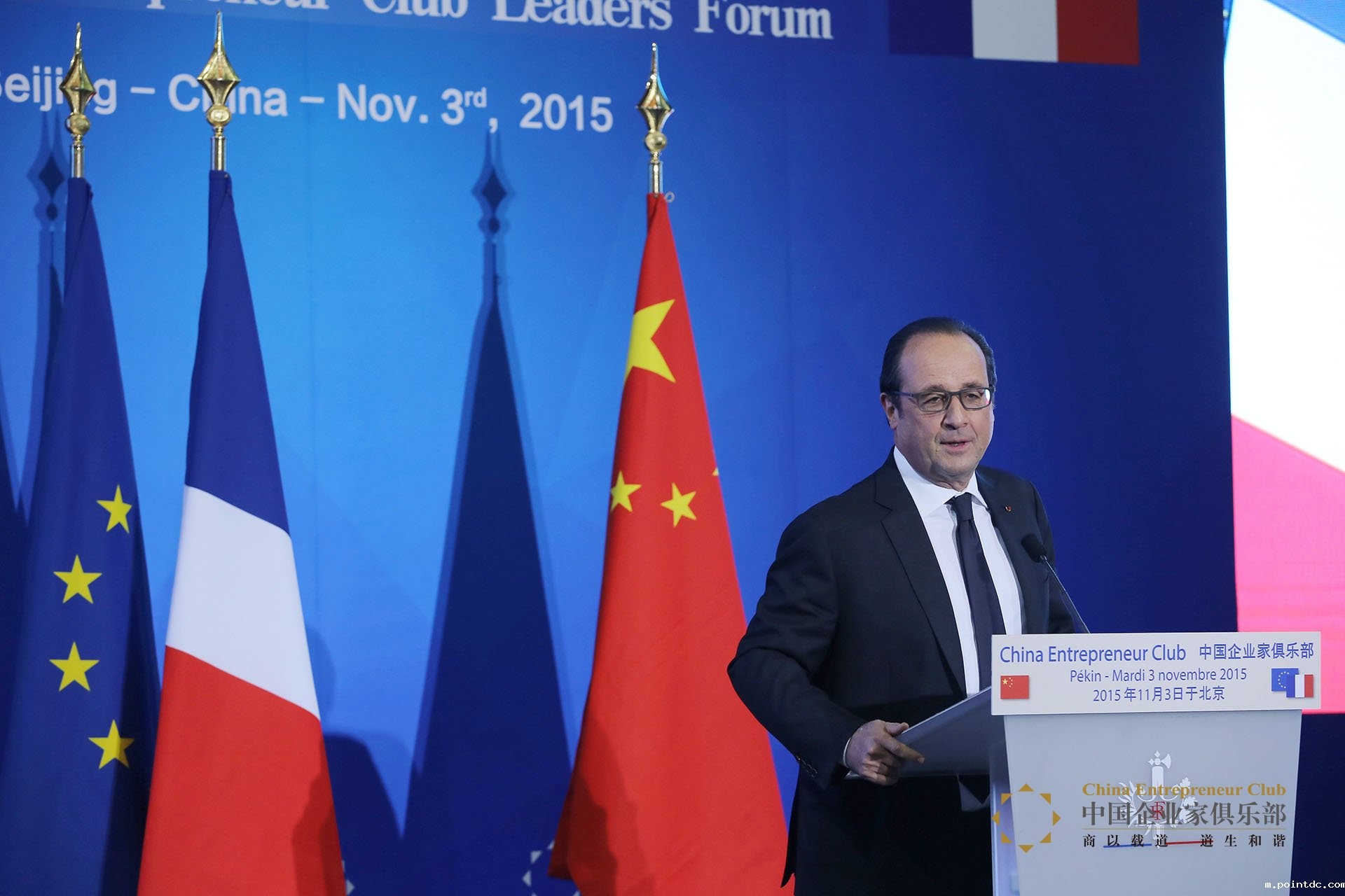 最后,奥朗德总统发表了主题演讲。他说:“法国对中国非常有信心,目前有3000家法国企业在中国开展业务,他们在中国的总雇员人数将近50万人。另外,中国在法的投资,在过去的几个月当中有着大幅度的增长,如今在法国已经有200多家中国企业开展业务,总雇员人数达到2万多人。法国现在是中国对欧投资的第三位的国家。”