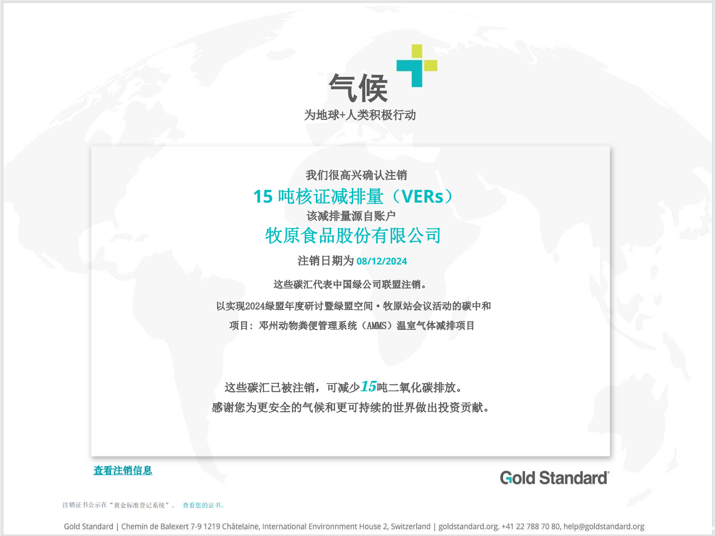在牧原的支持下,本次活动根据生态环境部发布的《大型活动碳中和实施指南(试行)》,核算了本次会议的温室气体排放量,合计14.23吨CO2e。牧原使用在黄金标准(GS)登记签发的15吨减排量进行抵消,实现了本次会议的碳中和。牧原也将为绿盟活动实现碳中和做出持续的贡献。